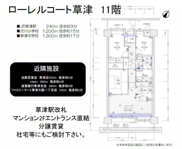 ■JR草津駅 240m 徒歩約3分 ■渋川小学校 1200m 徒歩約15分 ■草津中学校 1300m 徒歩約17分 ■草津駅改札から2Fエントランスまで直通 ■近鉄百貨店草津店 350m 徒歩約5分 ■フレンドマート草津大路店 350m 徒歩約5分 ■niwa+ 280m 徒歩約4分 ■滋賀銀行草津支店 280m 徒歩約4分 ■(株)パブリックホーム■ ■賃貸・売買・不動産のことなら何でもご相談ください ■077-599-3911に事前にご連絡を頂くと、スムーズにご見学可能です。 ■ホームページも随時更新中【栗東 パブリックホーム】でご検索ください。 |